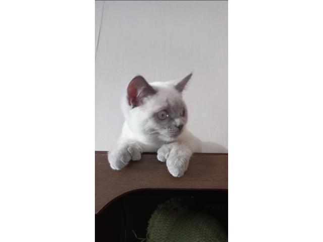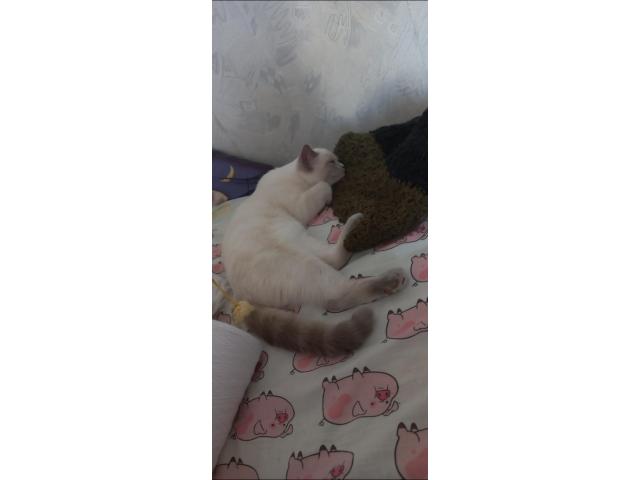 Домашняя, окрас как у сиамской, глаза светло-голубые. Шерсть БЕЛАЯ, хвост, уши, мордочка и лапы СЕРЫЕ. 4 месяца, вес 1.5 кг, подросток.