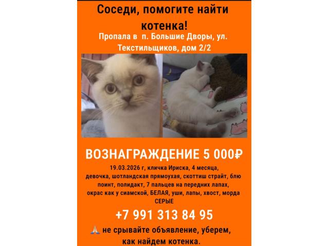 Котенок с паспортом, подали заявление на розыск в полицию, расклеили объявления.
